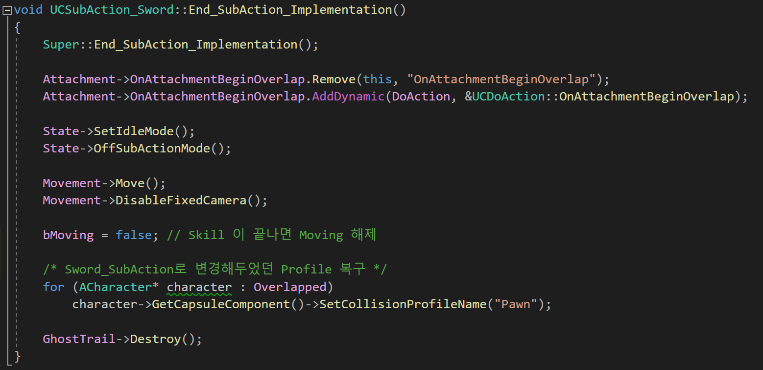 스킬의 작동이 끝났을때는, bMoving을 false로 하여 더이상 이동하지 않도록 Tick을 멈추고, Overlap 되었던 캐릭터들의 Collision Profile을 다시 Pawn으로 원상복구 시켜주었다.