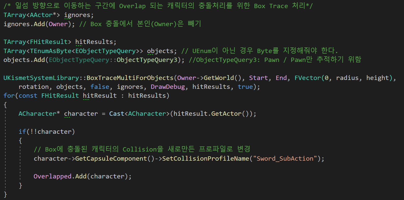 시작 지점부터 끝 지점까지 플레이어 높이와 너비의 박스크기를 설정하여 충돌을 검사하였고, 해당 Box Trace에 충돌된 Pawn들을 ACharacter로 형변환하였다.
