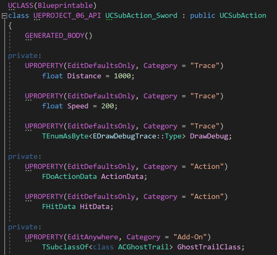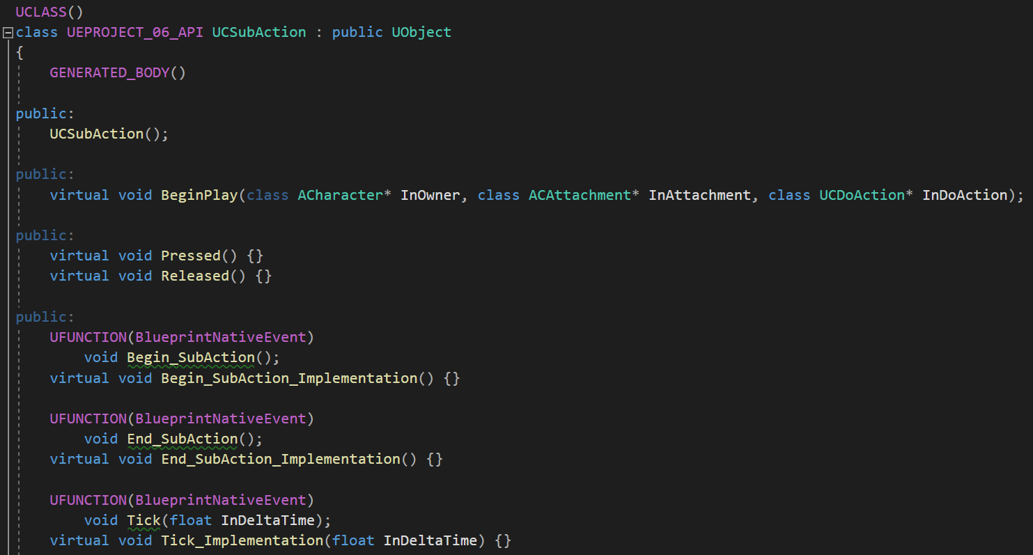 먼저, 일섬스킬을 구현하기 위해 UCSubAction을 상속받는 UCSubAction_Sword 클래스를 생성해주었다.