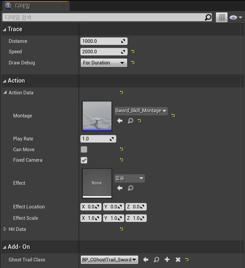 만들어두었던 CSubAction_Sword 클래스 기반의 블루프린트를 생성하고, 적절한 속성값들을 초기화 해 주었다.