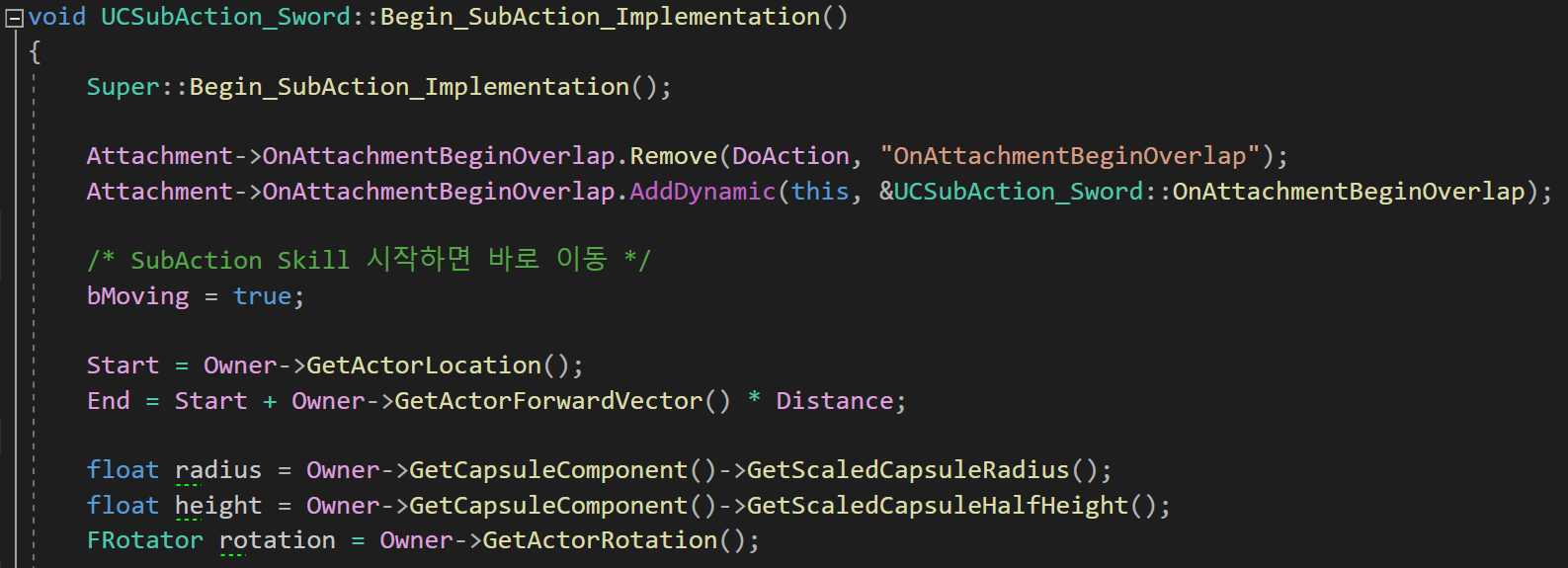 일섬 스킬인 SubAction_Sword 클래스가 시작될 때 바로 이동할 수 있도록 bMoving을 true로 설정해주었다.