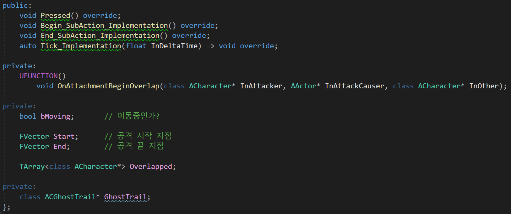 일섬 스킬로 이동중인지를 나타낼 bMoving 변수와 이동 지점을 관할하는 Start, End FVector를 선언하고, 일섬으로 Overlap 충돌된 캐릭터 객체들을 담을 배열도 선언하였다.