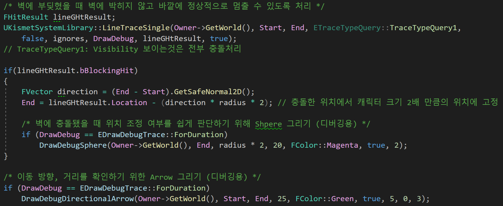LineTrace를 통해 Visibility인 객체를 모두 검사하였고, 충돌된 객체가 있다면 이동하던 방향은 그대로 두고, 캐릭터 반지름의 2배만큼의 뒤쪽에 위치를 재조정하였다.