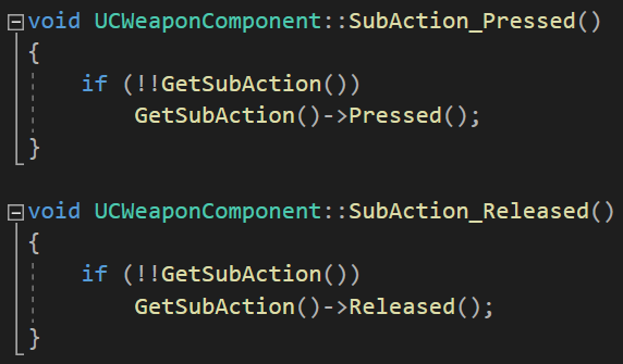 WeaponComponent에서는 SubAction 객체가 존재한다면 해당 객체의 Pressed 함수와 Released 함수를 호출하도록 하였다.