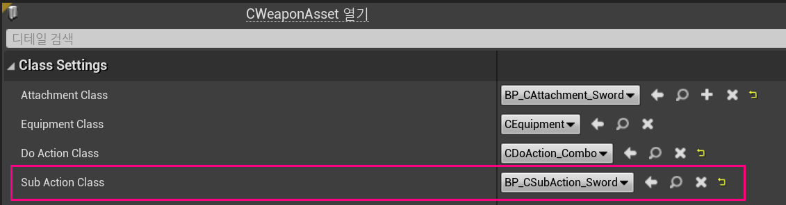 이후, DA_Sword의 데이터 애셋의 Sub Action Class에 생성한 BP_CSubAction_Sword를 설정해주었다.