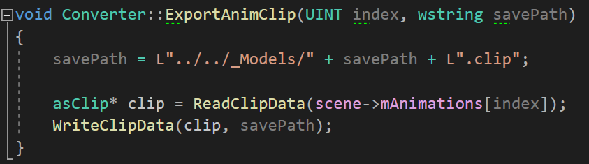 ExportAnimClip 함수: 지정된 인덱스의 애니메이션 클립을 내보내는 함수입니다. 읽어온 애니메이션 클립 데이터를 .clip 파일로 저장합니다.