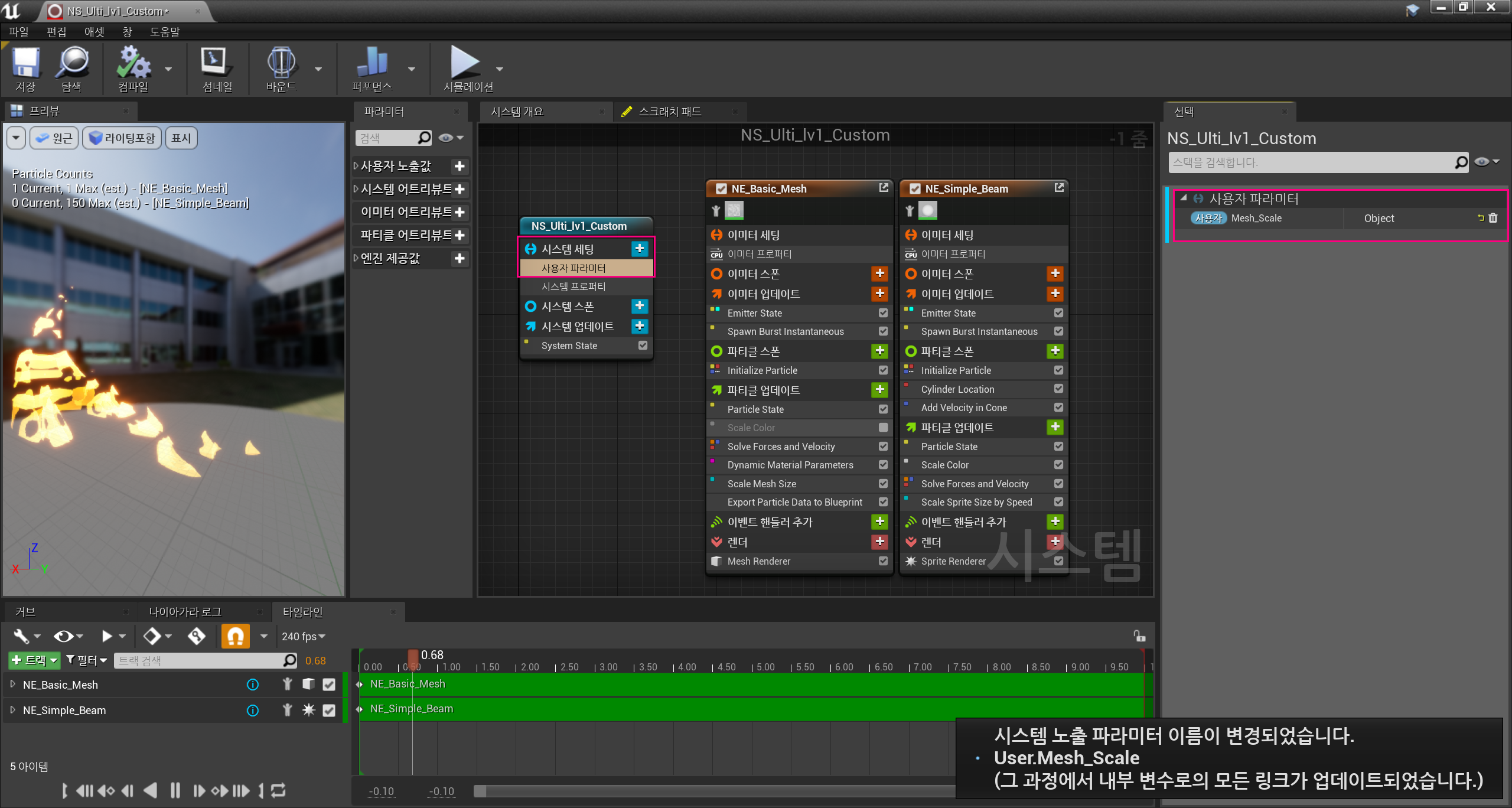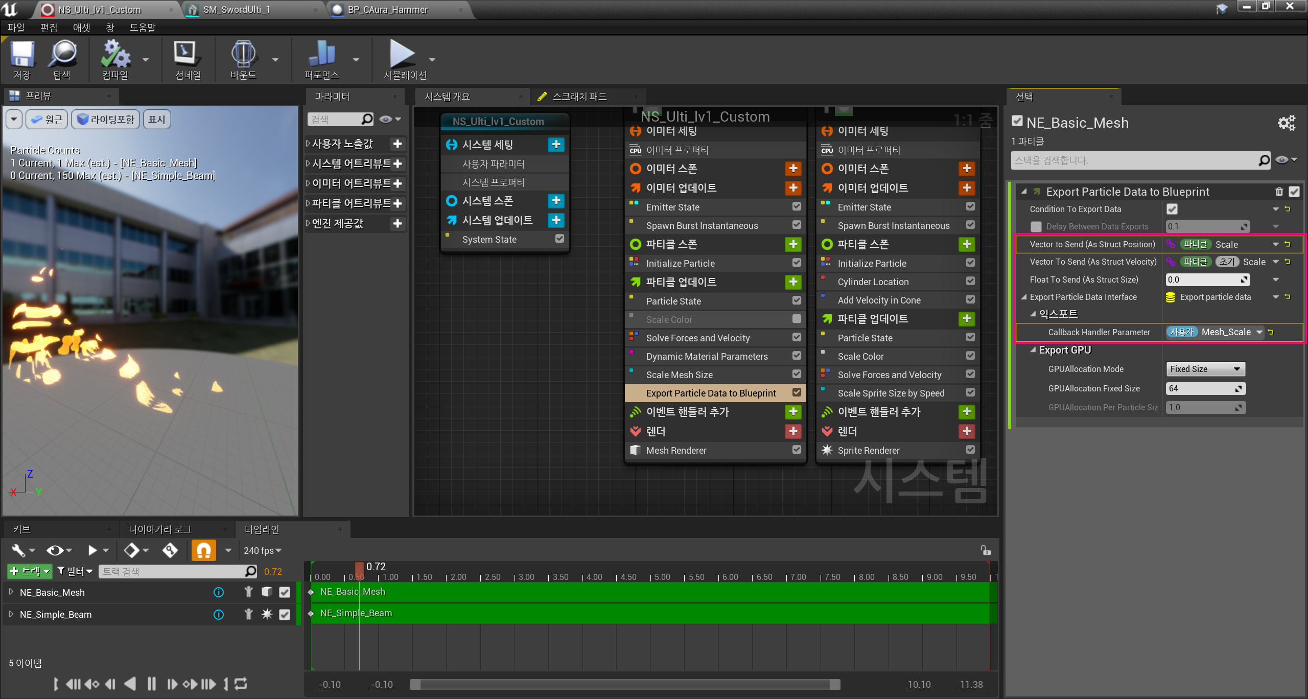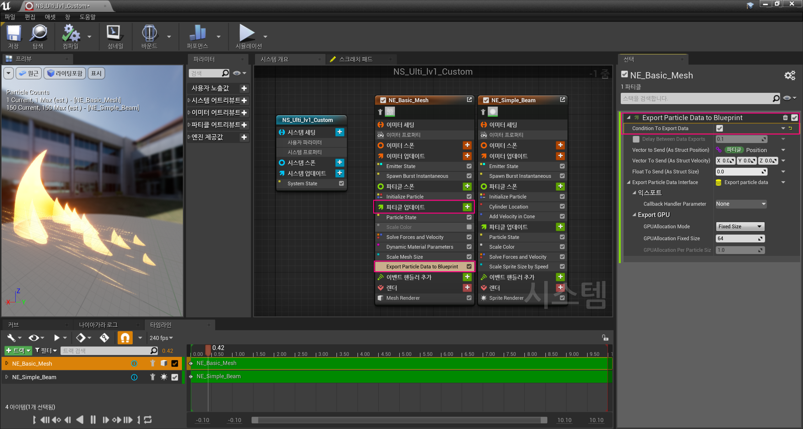 주된 Slash인 NE_Basic_Mesh에 파티클 업데이트 항목을 선택하여 "Export Particle Data to Blueprint"를 추가해주었다.