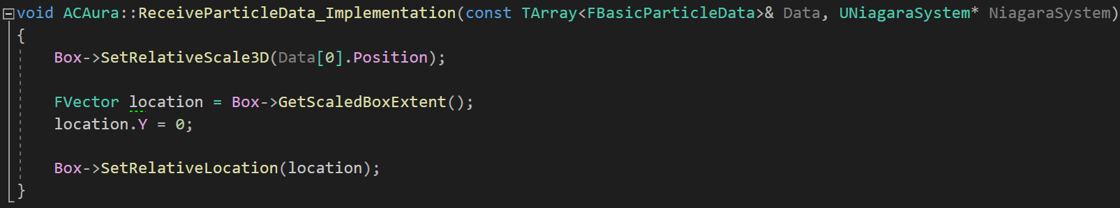ACAura 클래스의 BeginPlay 함수에서는 Niagara의 SetNiagaraVariableObject 함수를 이용하여 Export로 전달해주었던 데이터를 Niagara 객체에 받아오도록 하였다.