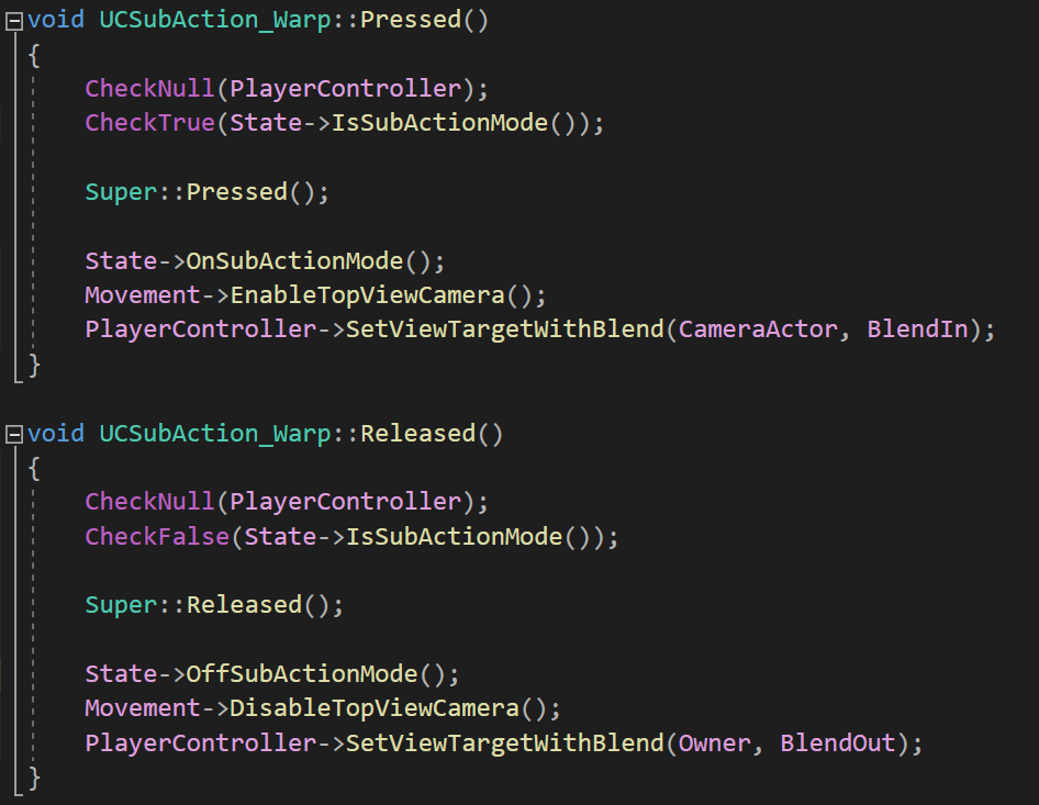 SubAction 입력키를 누르는 순간(Pressed) StateComponent의 상태를 SubActionMode로 설정하고, Movement Component의 TopViewCamera를 활성화시켰다. 이후, PlayerController의 SetViewTargetWithBlend 함수로 Camera를 변경해주며 시점을 전환해주었다.