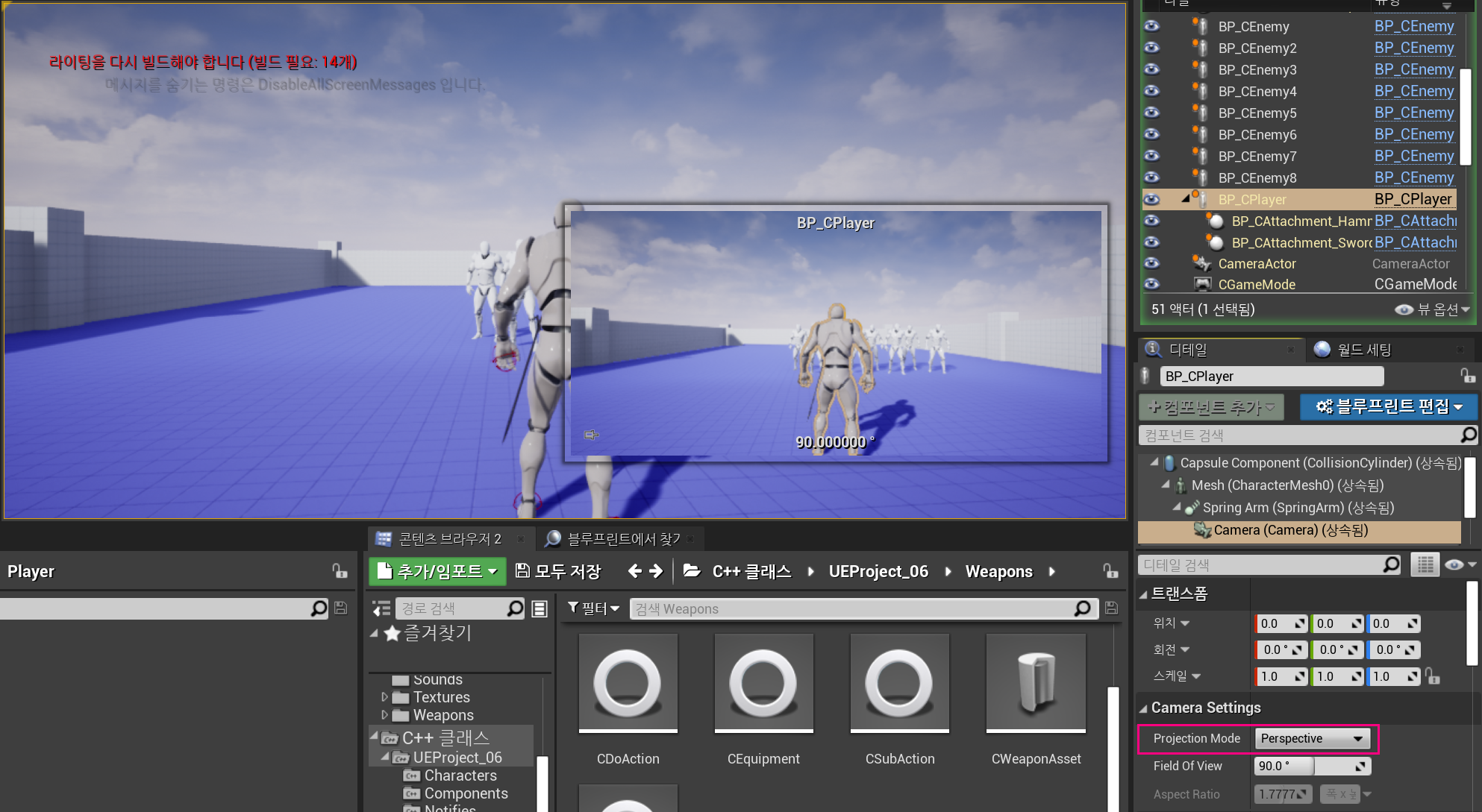 시점을 변경할 Camera Class인 ACameraActor를 저장해주었고, 카메라의 ProjectionMode 설정 값을 변수로 선언해주었다.