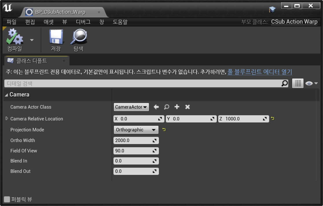 만들어진 CSubAction_Warp 클래스를 블루프린트로 생성한 뒤, 직렬화했던 변수들을 원하는 값으로 조정해주었다.
