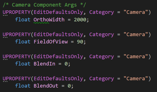 이후, Camera Component의 속성값으로 초기화되는 변수들을 선언하였다.