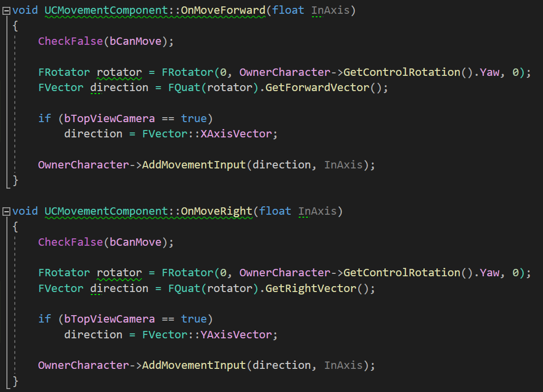 이렇게 설정된 bTopViewCamera 변수에 따라 캐릭터가 OnMoveForward 할때나 OnMoveRight할 때의 방향값을 각각 XAxis, YAxis로 변경해주었다.
