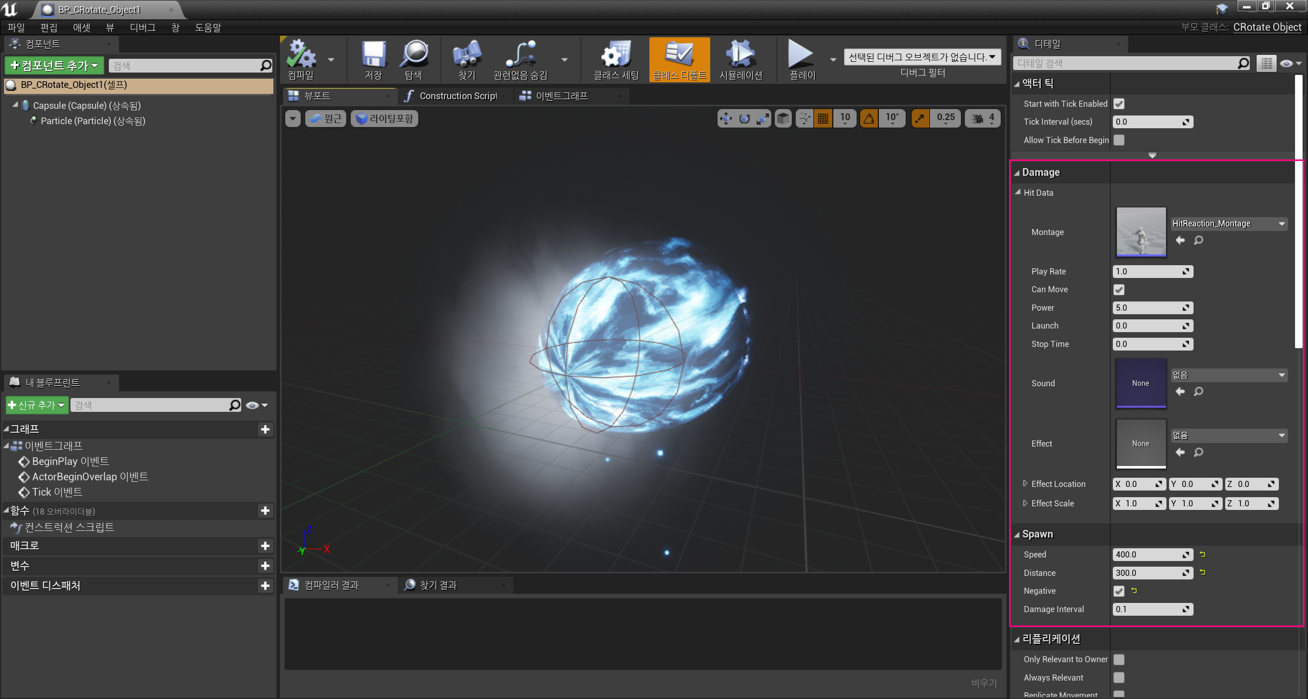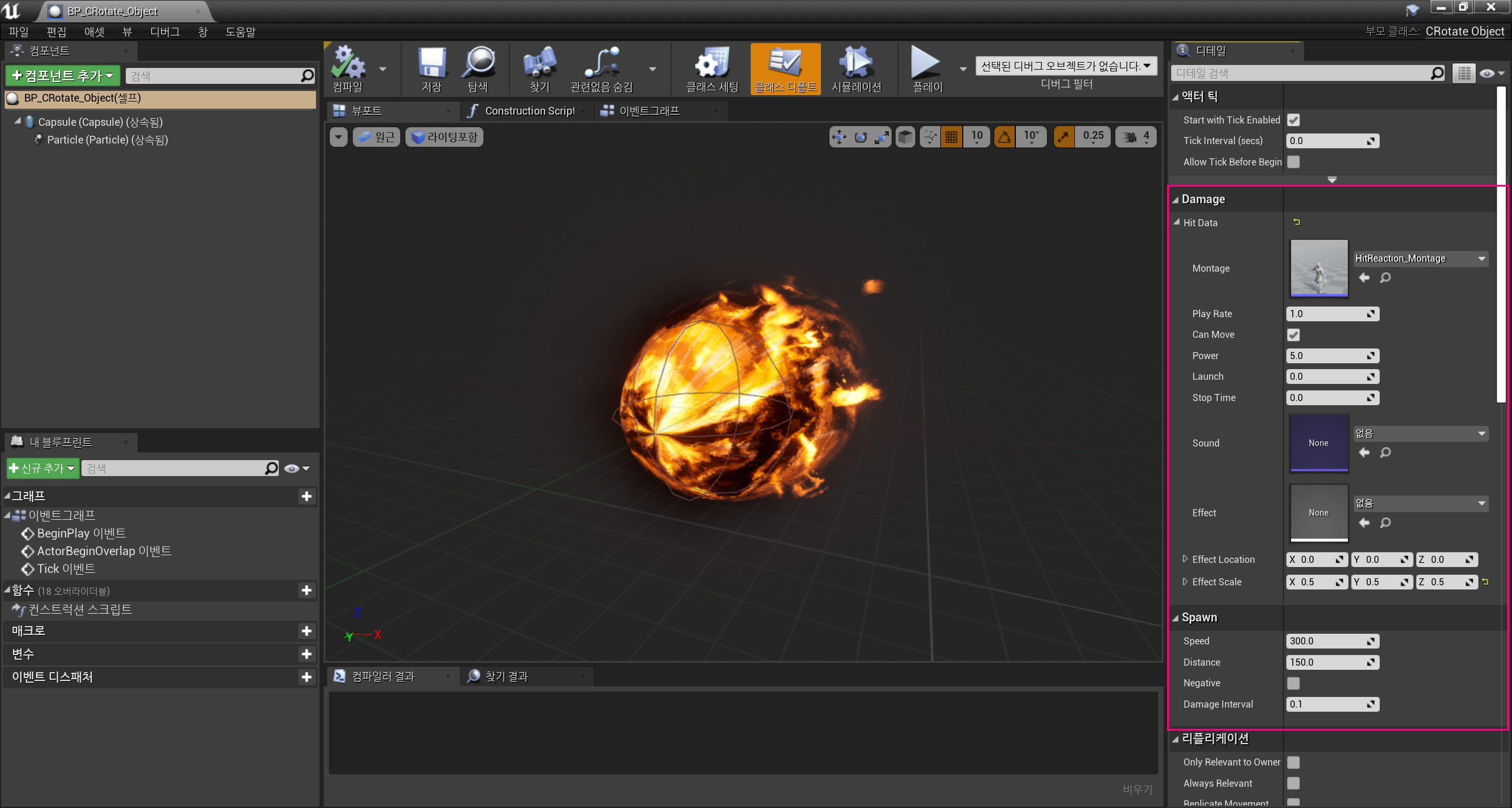 컴파일 후, CRotate_Object 클래스를 기반으로 블루프린트 클래스를 생성하고, 직렬화했던 속성값들을과 파티클을 각각 설정해주었다.