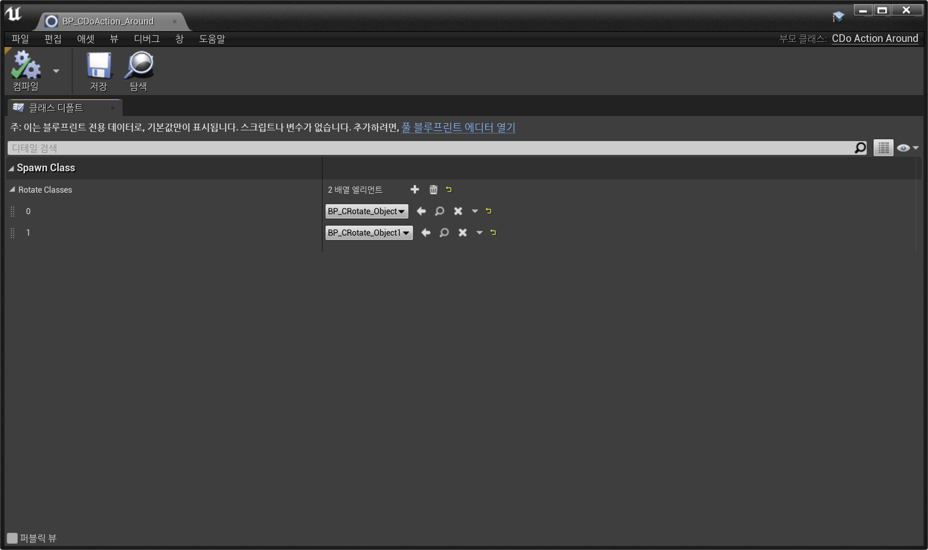 생성된 BP_CRotate_Object를 BP_CDoAction_Around 클래스의 Rotate Classes 배열에 추가해주면, Begin_DoAction 시 해당 배열에 들어간 클래스가 랜덤으로 Spawn 될 것이다.