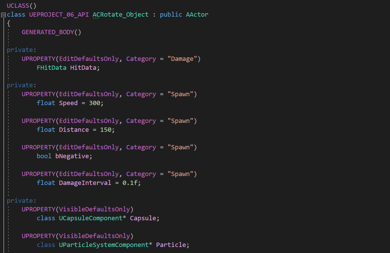 CRotate_Object 클래스에는 Object에 충돌했을 때 캐릭터에게 들어갈 HitData와, 회전 속도(Speed), 플레이어로부터의 거리(Distance), 역방향으로 회전할 것인지(bNegative), 데미지 처리 간격(DamageInterval) 속성값이 존재하고,