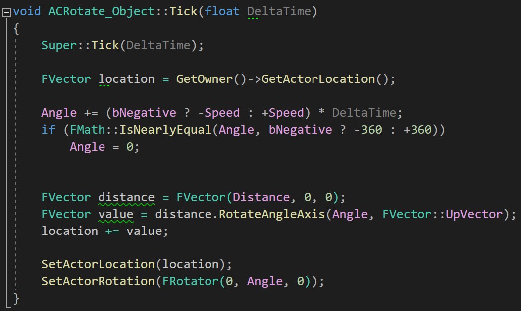 현재 Owner의 Location을 받아오고, 역방향 회전인지를 판별하기 위한 bNegative 변수를 이용하여 Speed와 DeltaTime을 곱해 Angle을 점차 증가시키거나 감소시켜주었다.