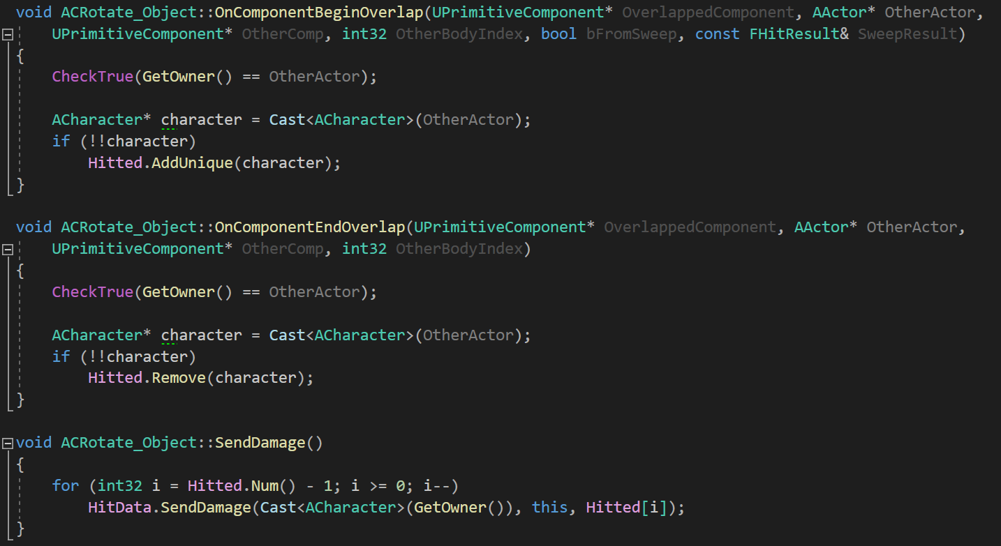 Rotate_Object 객체의 충돌처리는 BeginOverlap / EndOverlap 함수를 통해 구현하였고, Hitted 배열에 충돌된 Character 객체들을 저장하여 중복 데미지 처리를 방지하였다.