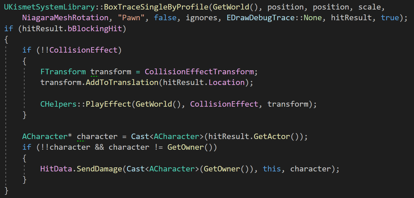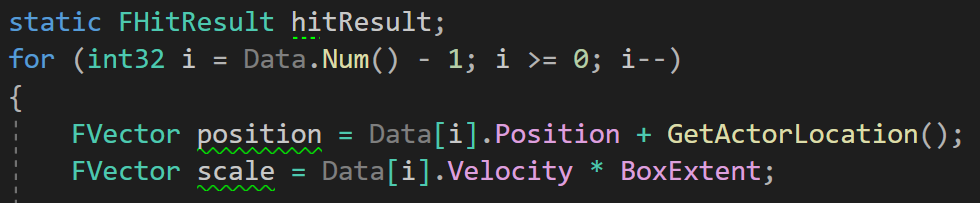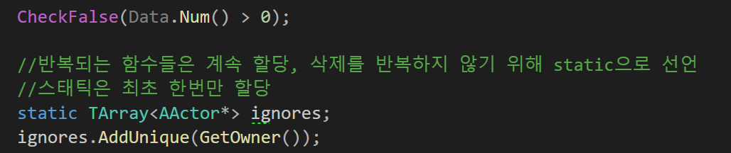 BoxTrace 검사 시 사용되는 ignore 배열은 static으로 선언하였다. Tick 함수처럼 업데이트가 지속적으로 일어나는 함수에서 반복되는 함수나 변수들은 static으로 선언하여 초기 한번만 할당 후 사용하는 것이 효율적이다.