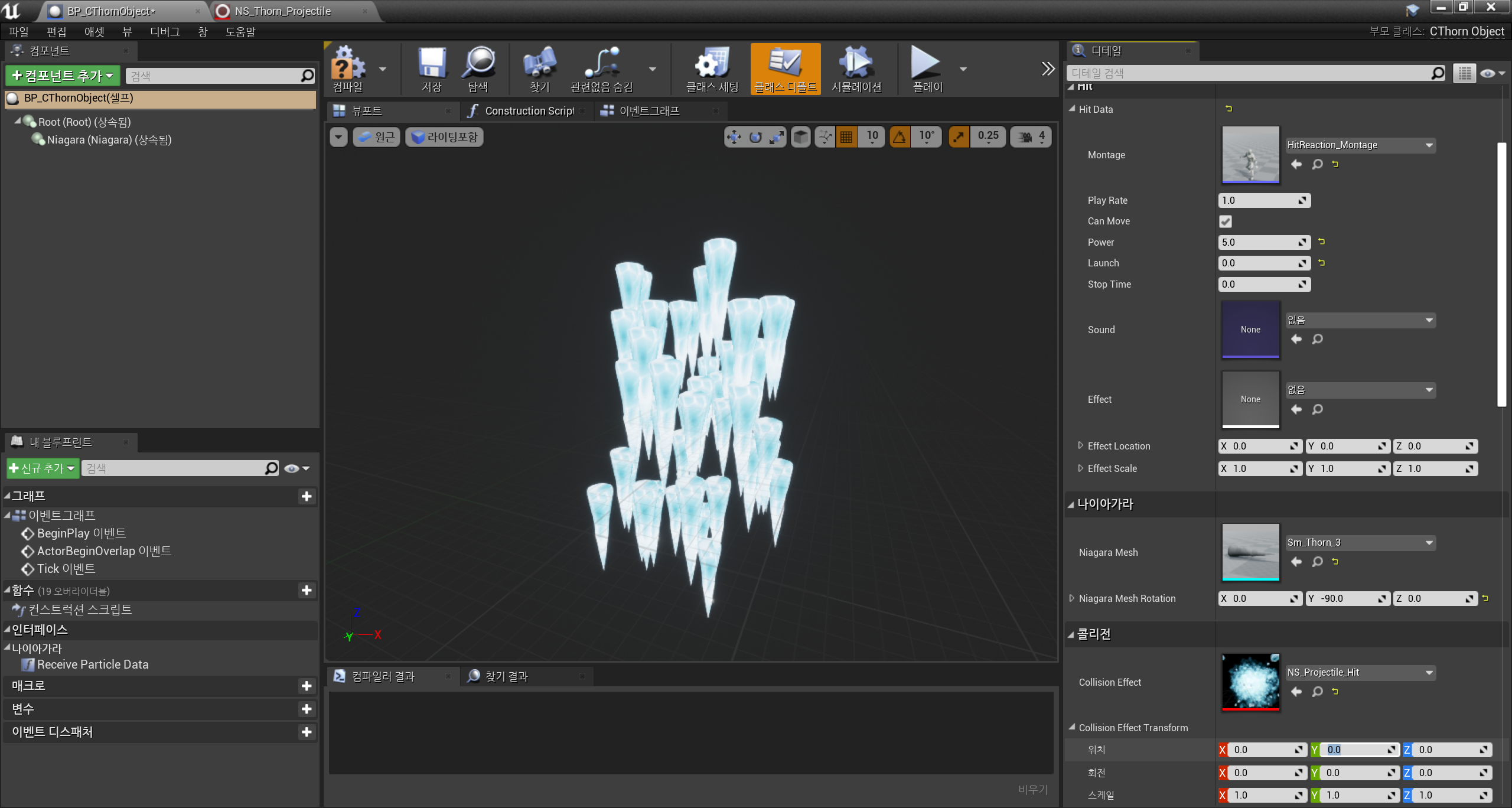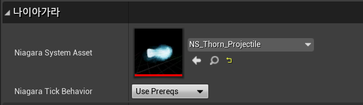 가시 객체에는 충돌체의 크기를 구하기 위한 Static Mesh와, Mesh를 회전시킬 방향(NiagaraMeshRotation), 충돌 시 나타날 Effect, 충돌 Effect의 Transform의 속성을 지정해주었고,