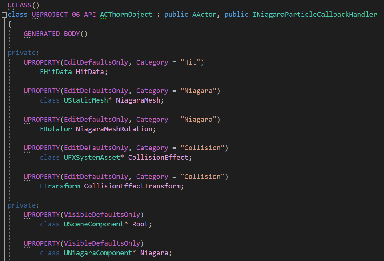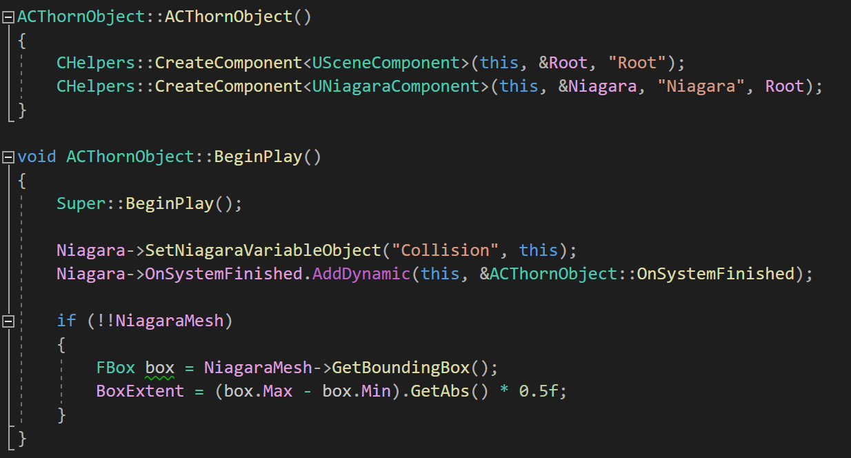 ThornObject의 생성자에선 컴포넌트를 생성한 뒤, BeginPlay 함수에서는 Niagara의 OnSystemFinished 델리게이트를 등록해주었다.