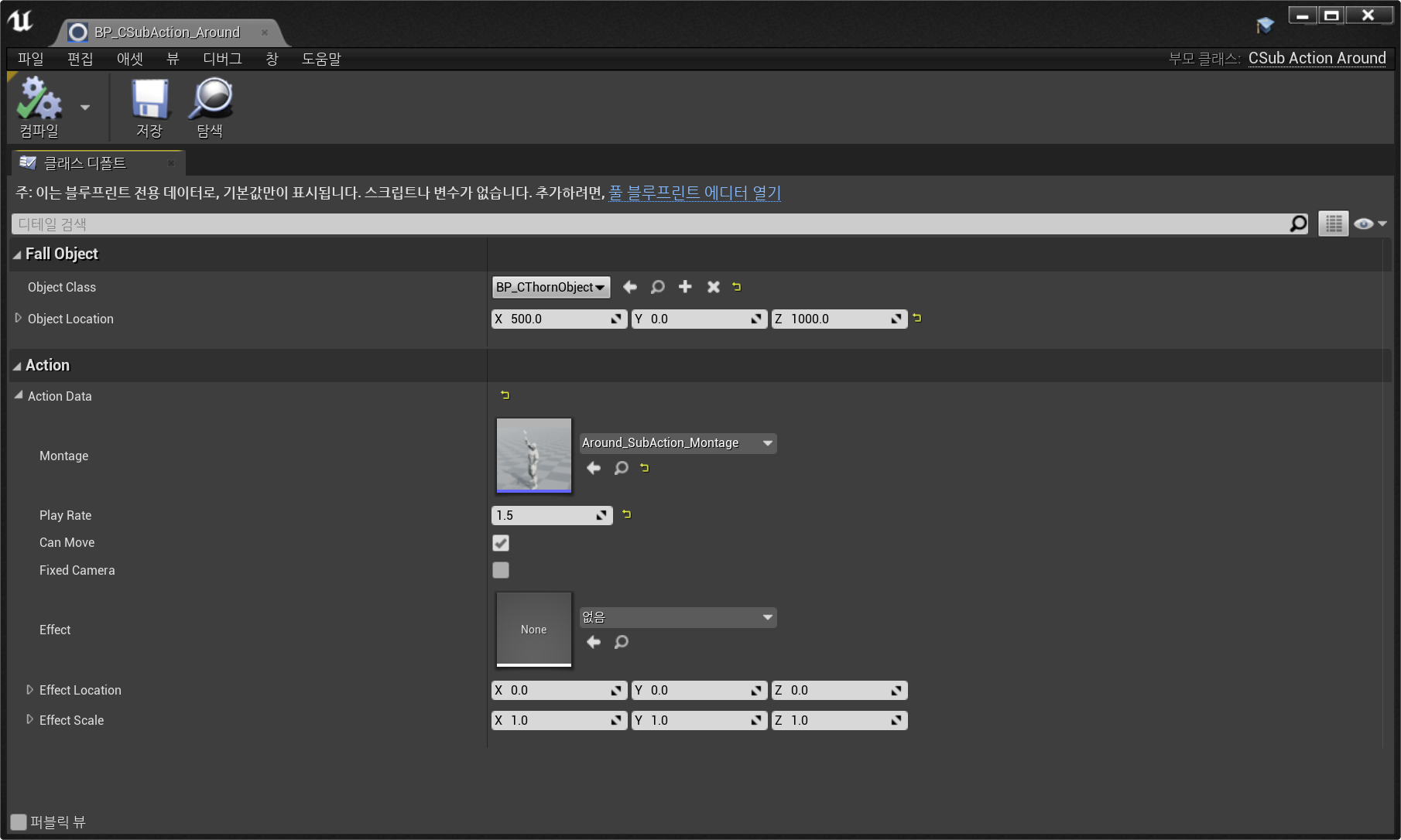 컴파일 후 CSubAction_Around 기반 블루프린트를 생성하여 Object Class 속성에 BP_CThornObject 클래스를 설정해주었다.