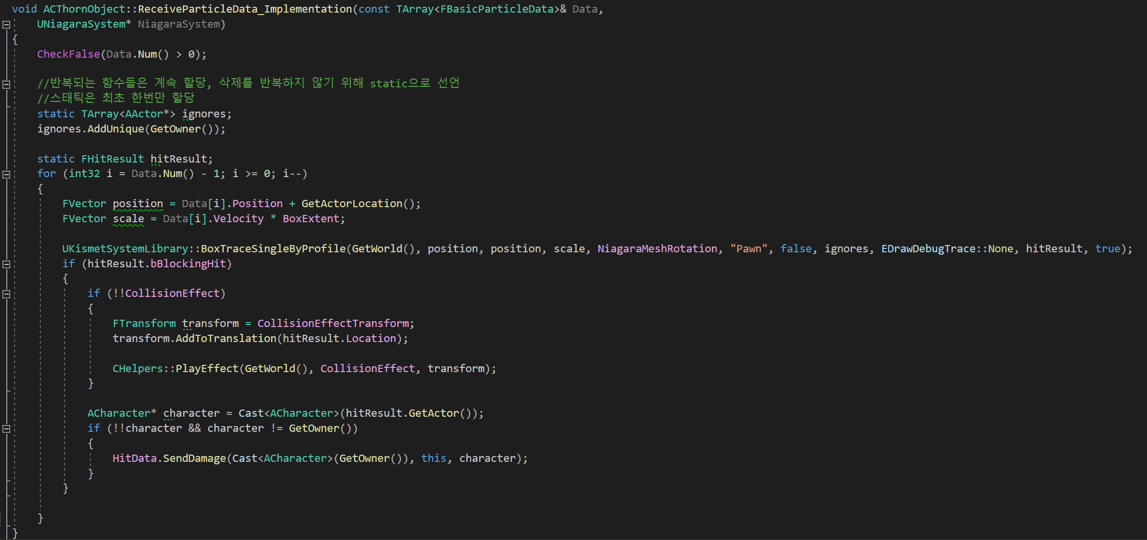 즉, SetNiagaraVariableObject 함수를 통해 해당 Collision 변수의 Object값으로 CThornObject 객체를 this로 전달하여 할당한다는 뜻이다.