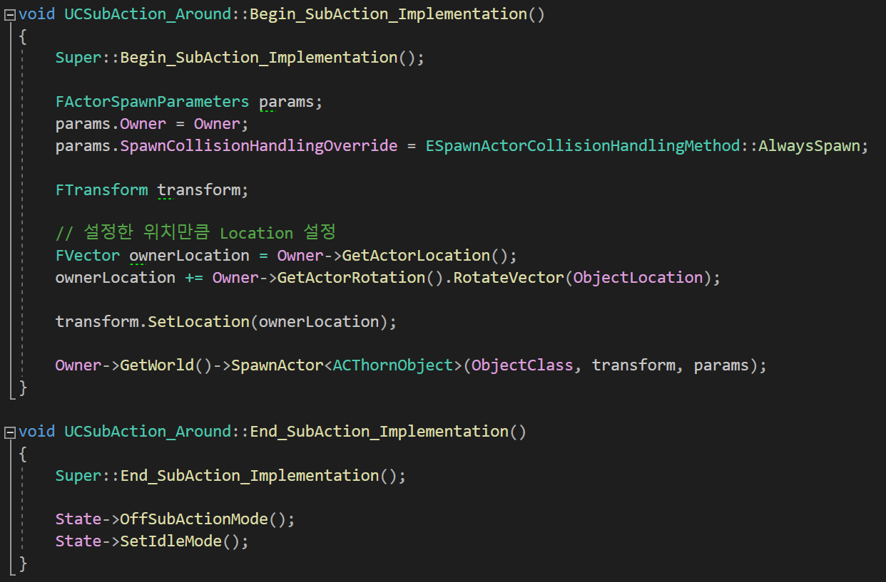 Begin_SubAction함수에서는 만들어진 ThornObject 클래스를 통해 Thorn 액터를 스폰하였고,