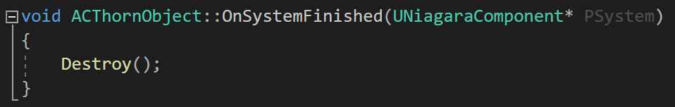 마지막으로 나이아가라 시스템이 끝났을 때 호출되는 OnSystemFinished 함수에서는 ThornObject 객체를 Destroy 하도록 작성하였다.
