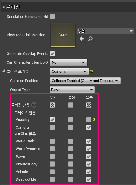 Collision Enabled는 위에서 설명한 충돌의 종류에 따라 다르게 설정해야 한다.