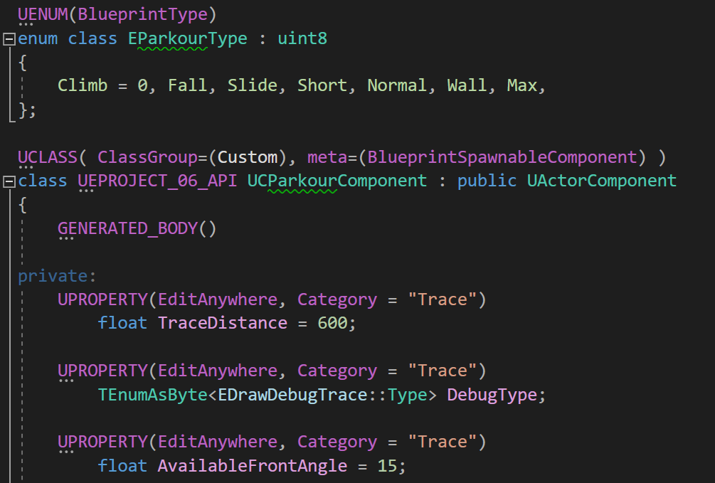 Parkour 충돌을 검사하는 거리(TraceDistance), 디버깅 시 필요한 EDrawDebugTrace, 측면에서 가능한 Parkour 각도(AvailableFrontAngle)를 속성값으로 선언하였다.