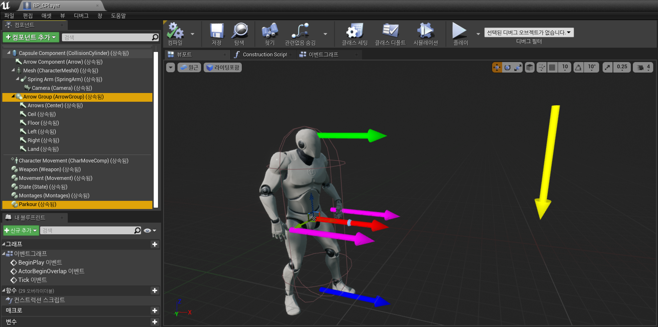 컴파일 후 CPlayer를 확인해보면 Parkour Component에서 만들어둔 ParkourArrowType Enum 값들의 이름대로 ArrowComponent가 추가된 것을 확인할 수 있었다.