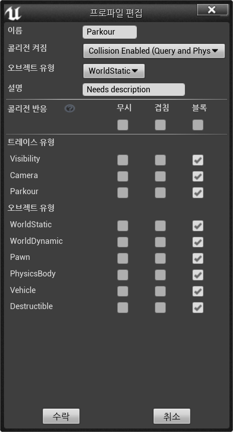 2023.02.15 - [🎮Unreal4/BluePrint] - [UE4] Parkour 기능 -1 (파쿠르가 가능한지 검증, Trace Channels)
