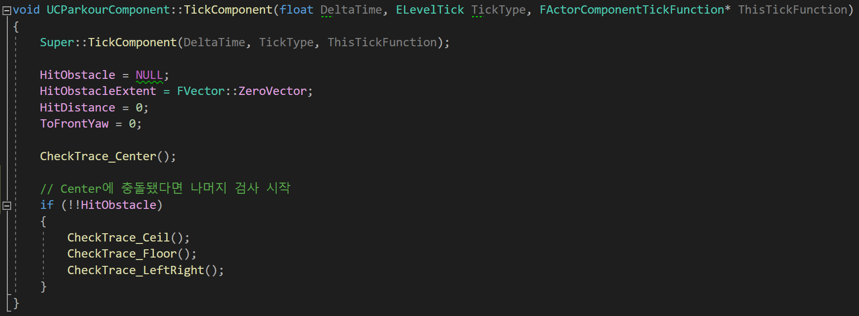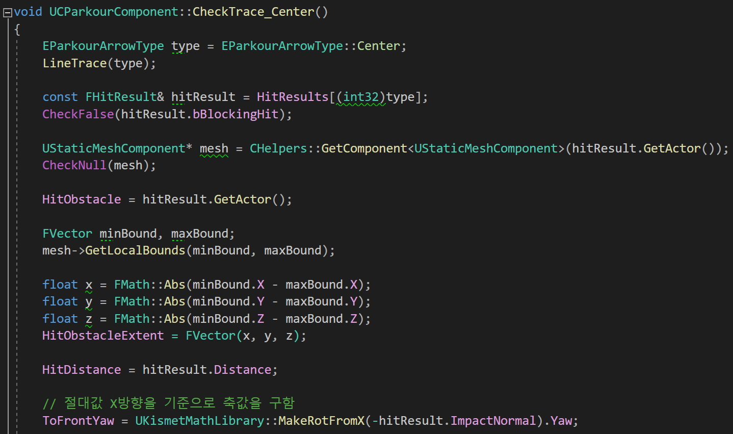 DoParkour 함수에서는 CheckTrace_Center에 충돌된 HitObstacle 객체를 한번 더 검사하는 Check_Obstacle 함수를 호출한다. Check_Obstacle 함수에 통과된 이후에는 각 Parkour의 종류마다 가능한지를 다시 한번 검사한 뒤, 해당 Parkour 동작을 수행한다.