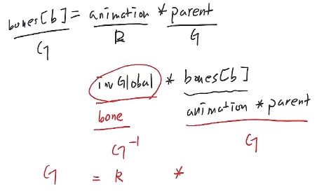 invGlobal * bones[b]는 풀어서 보면, invGlobal * (animation * parent)이다.