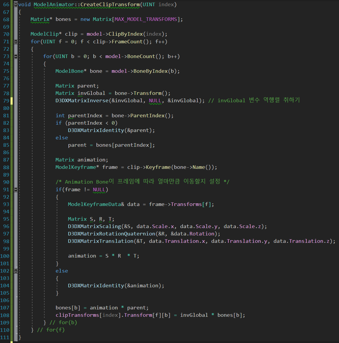 이런식으로 bones의 값을 계속 구하고, 해당 bones의 값을 토대로 ClipTransform을 초기화하여 애니메이션의 프레임마다 출력될 bone 정보가 정상적으로 연산될 수 있는것이다.