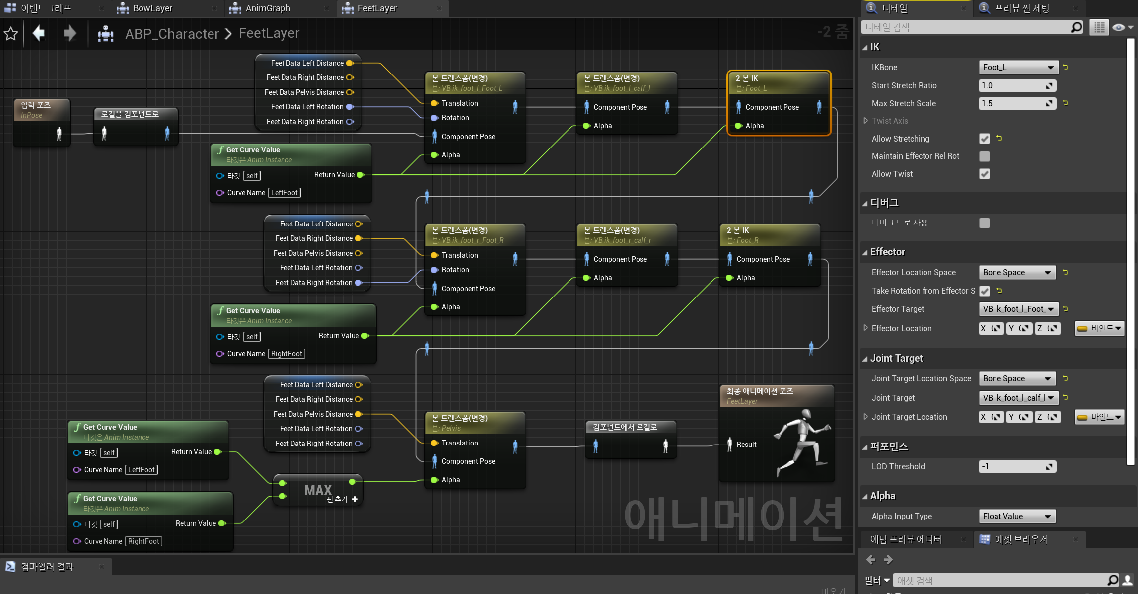 왼발과 오른발을 각각 구하고, 발이 내려감에 따라 자연스러운 애니메이션 동작을 위해 허리도 함께 내려갈 수 있도록 PelvisDistance도 추가하였다.
