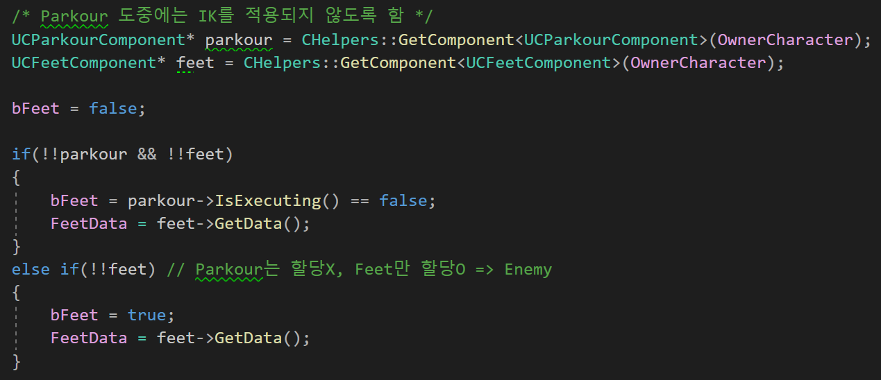AnimInstance 클래스의 Update 함수에서는 IK의 적용 상태인지를 지속적으로 판별하며 파쿠르가 수행되고 있다면 IK가 적용될 수 없도록 제한하였다.