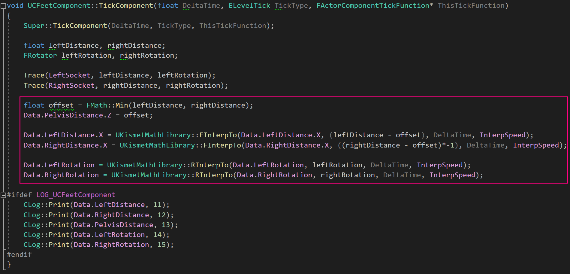 Tick 함수에서는 주기적으로 왼쪽 발과, 오른쪽 발의 충돌을 검사하여 각각의 발 아래 어떤 위치에 충돌체가 존재하고, 어떤 회전값을 가져야 하는지를 반환받는다.