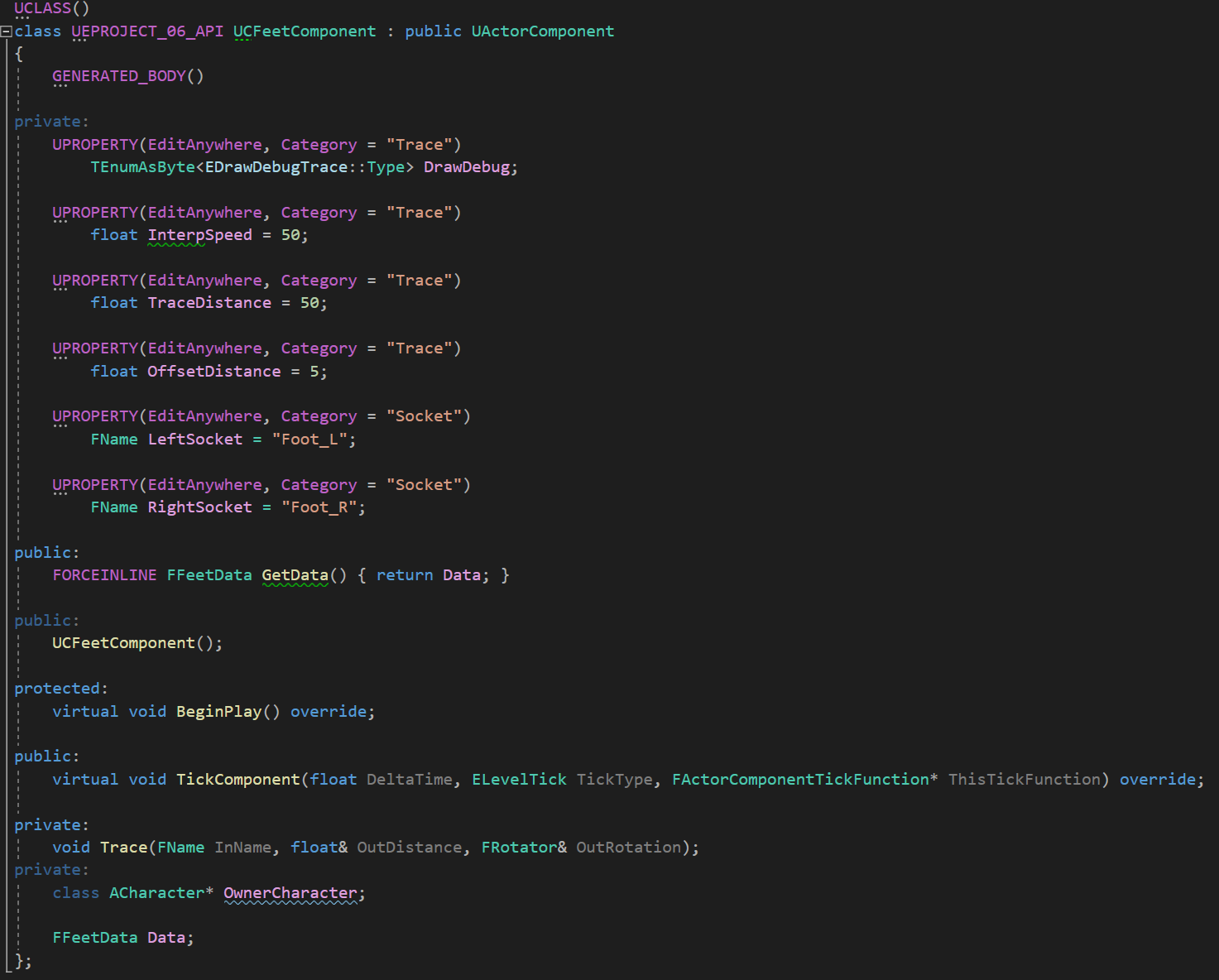 Feet Component 클래스 안에는 IK 연산에 필요한 변수 값들을 저장할 구조체 FFeetData를 선언해두었다.