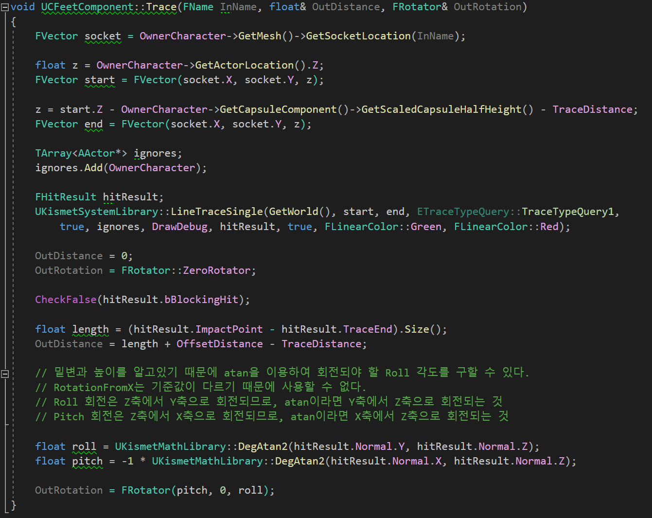 Trace 함수의 핵심은 발 아래로 검사 거리(Trace Distance)만큼 LineTrace를 수행하여 충돌 Object를 구하고, 해당 Object의 Impact Point와 Normal 값을 통해 OutDistance와 OutRotation을 구하는 것이다.