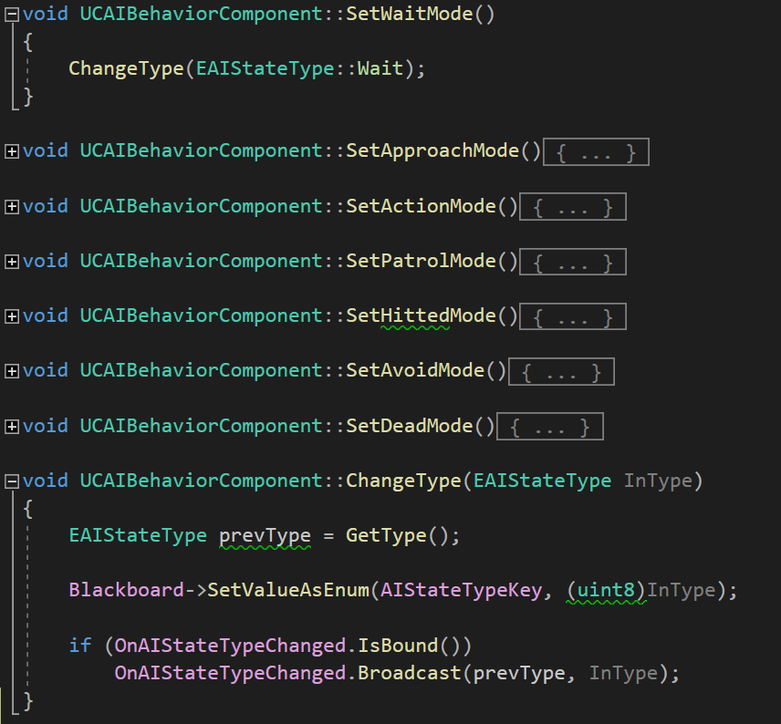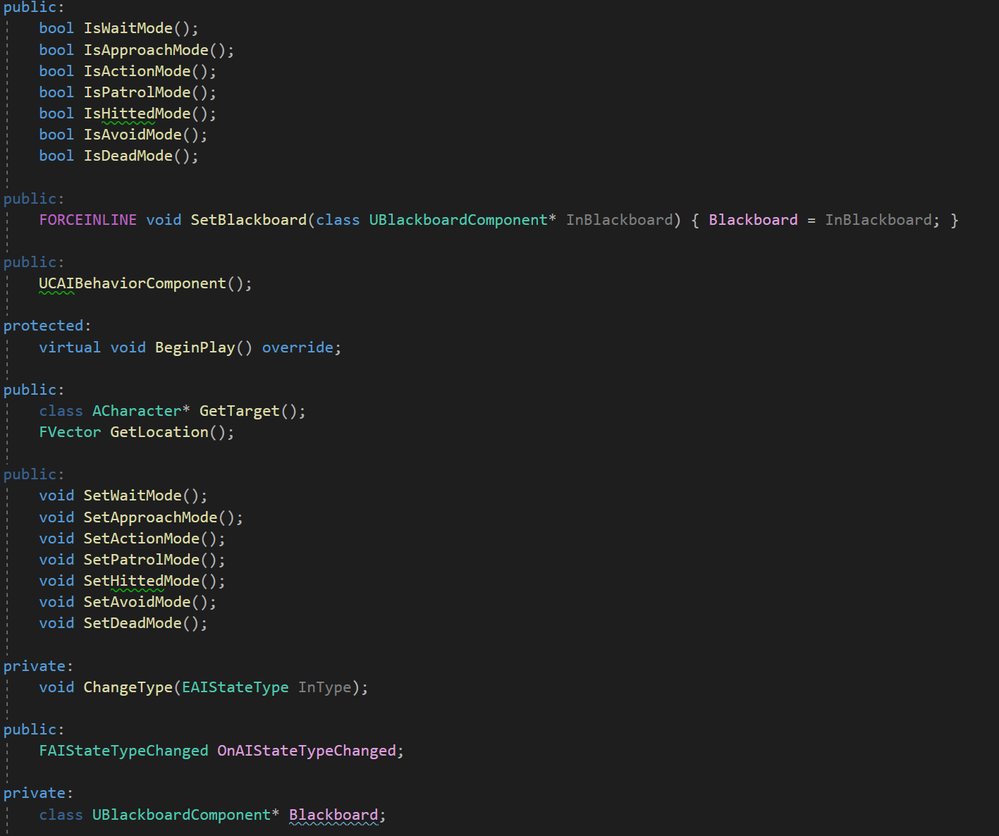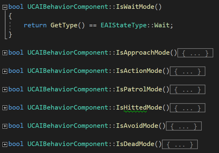 이후, 각각의 AI Type을 검사할 수 있는 Is~() 함수들과, 상태를 변경시킬 수 있는 Set~Mode() 함수들을 선언하였다.