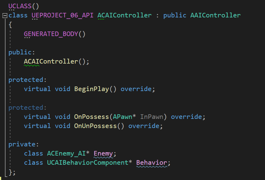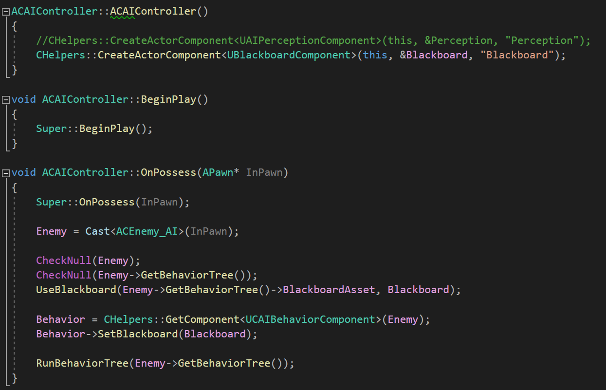 모든 EnemyAI가 공동적으로 상속받을 CAIController 클래스를 작성하였고, AAIController를 상속받아 구현하였다.
