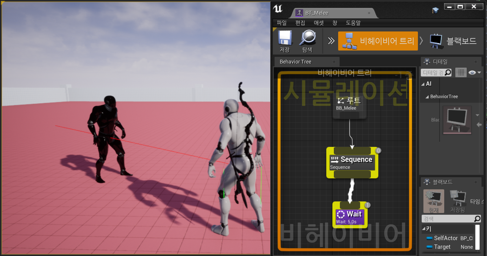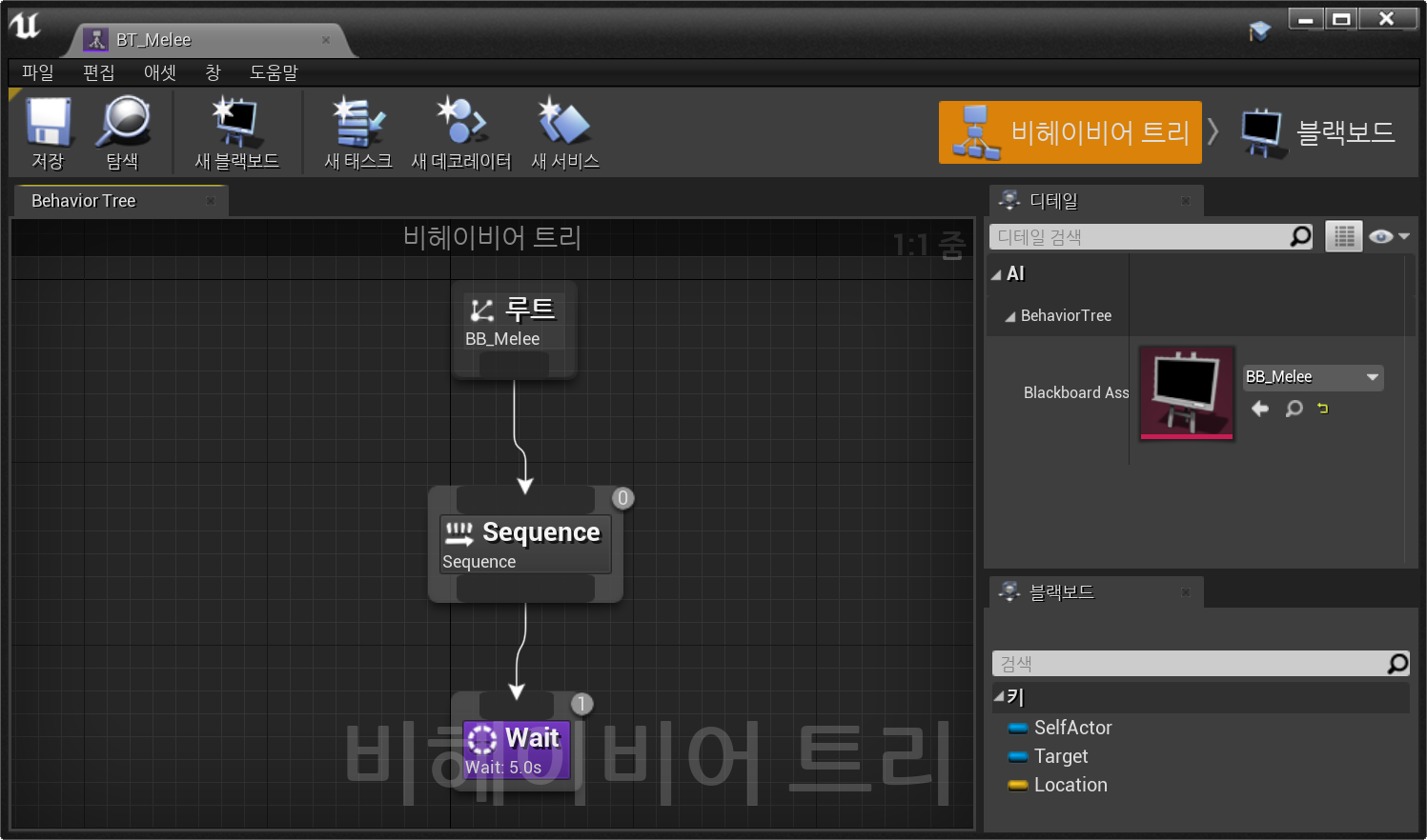 가장 먼저, 근접 Enemy인 Melee Enemy를 구현하기 위해 비헤이비어 트리인 BT_Melee와, 블랙보드인 BB_Melee를 각각 생성하고 연결해주었다.