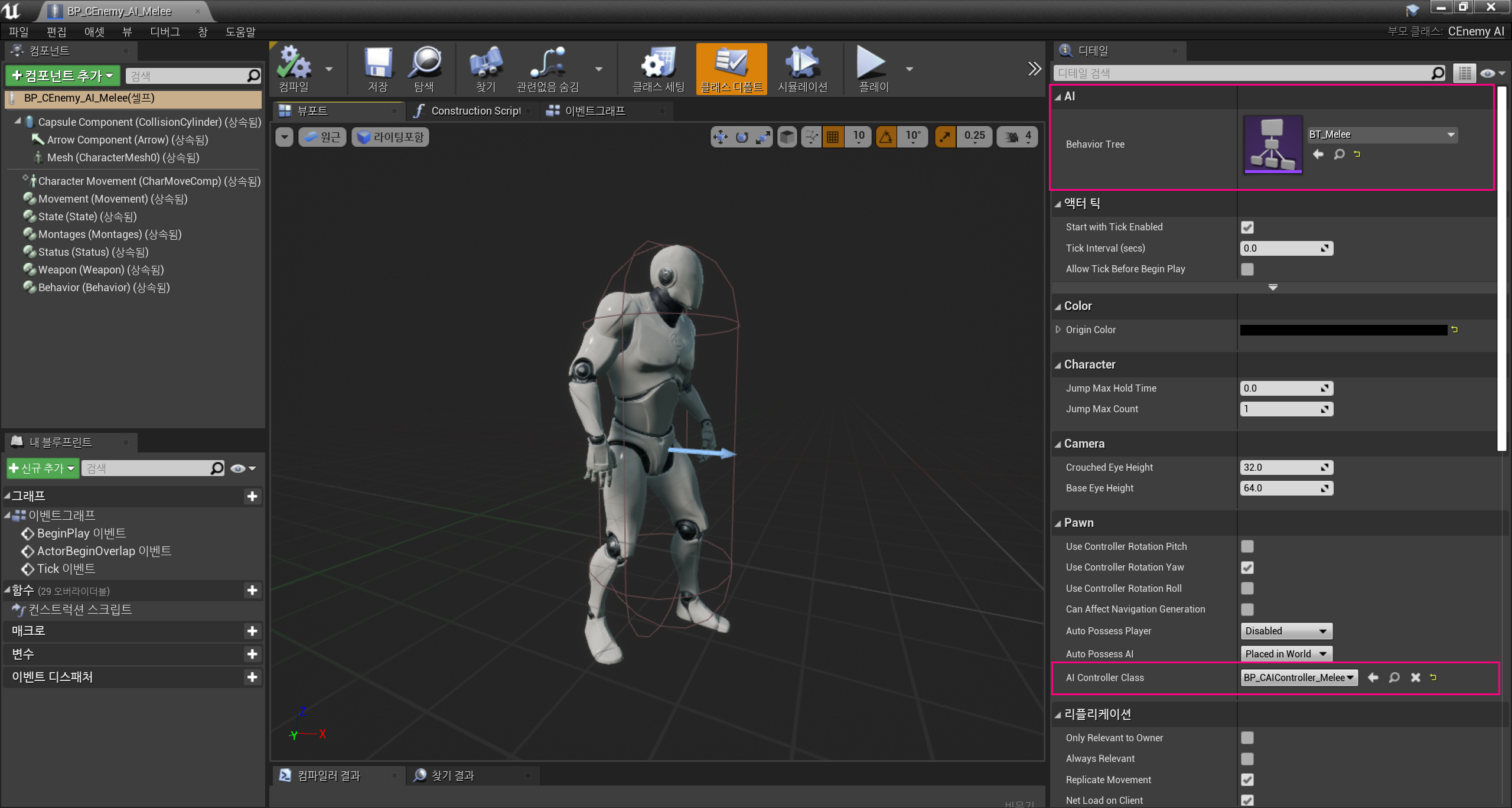 이후, Enemy 클래스에는 Behavior Tree와, AI Controller Class를 생성한 BP_CAIController_Melee로 설정해주었다.