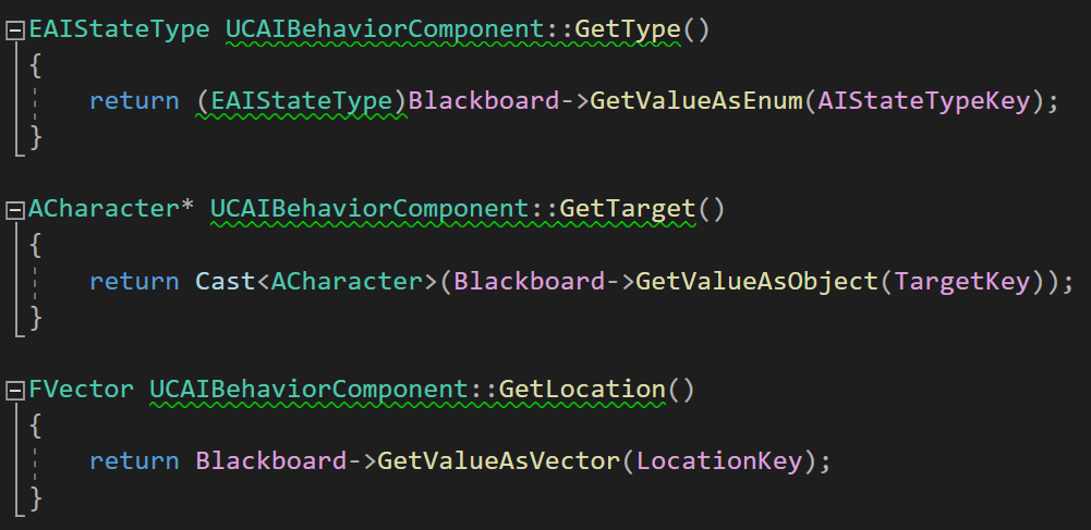 GetType, Target, Location 함수는 각각 블랙보드에서 GetValueAs 함수를 통해 값을 불러오도록 구현하였다.