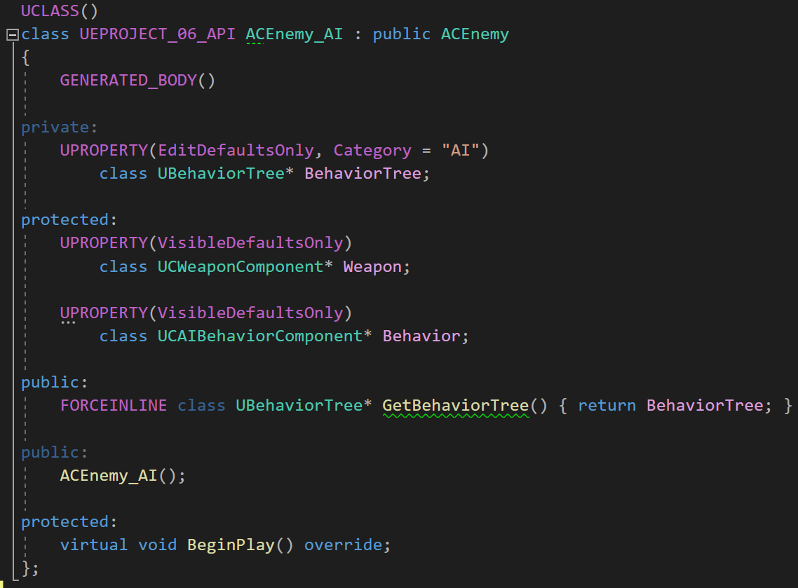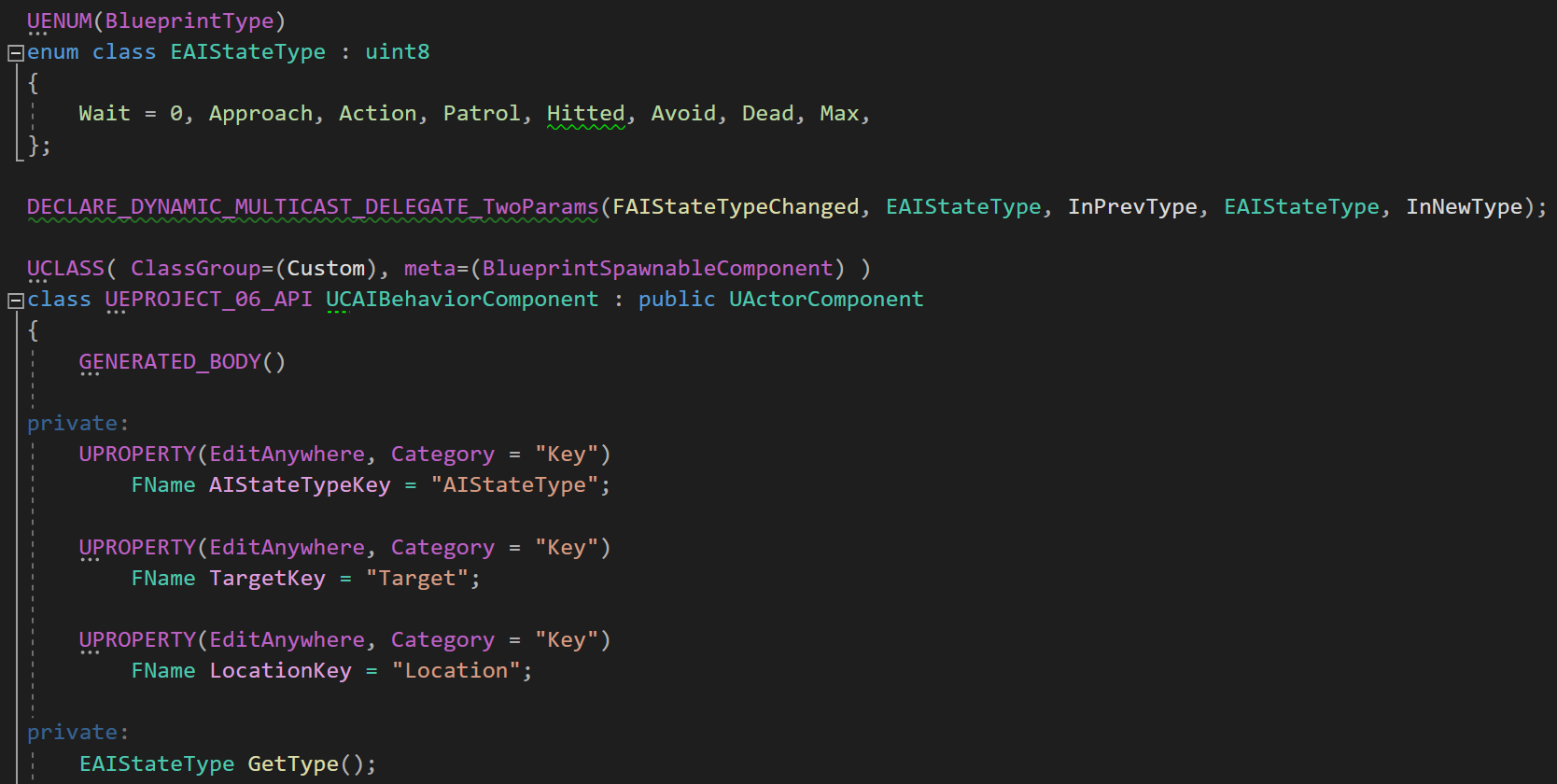 Behavior 컴포넌트에는 AI의 상태를 나타내는 EAIStateType 열거형과, 블랙보드의 Key 값들을 가져올 때 사용할 FName들을 각각 선언해주었다.