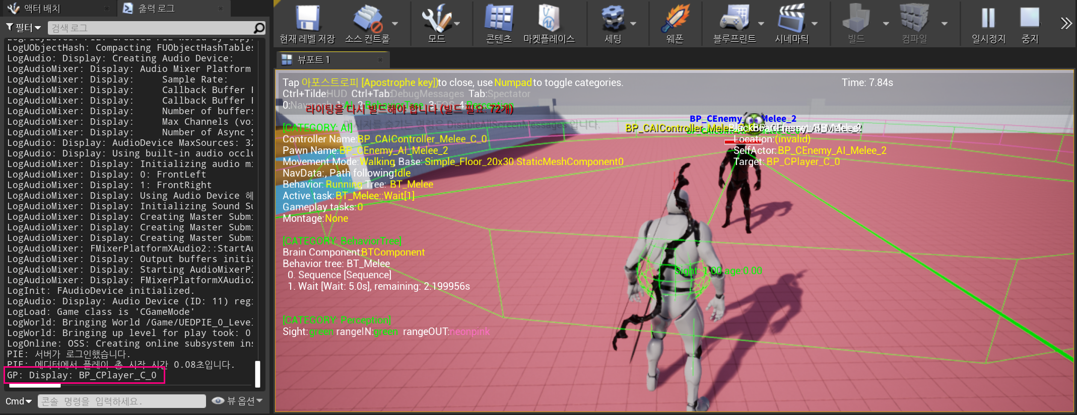 컴파일 후 실행시켜보면 Enemy의 감지가 잘 실행되고, 아까 테스트로 찍어둔 Log에 Player가 정상 출력되는것을 확인할 수 있었다.