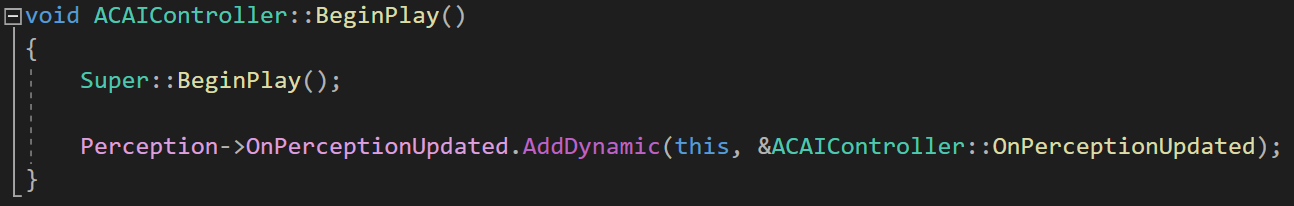OnPerceptionUpdated 함수는 UAIPerceptionComponent에 존재하는 Perception->OnPerceptionUpdated 델리게이트에 등록하기 위한 함수이다.