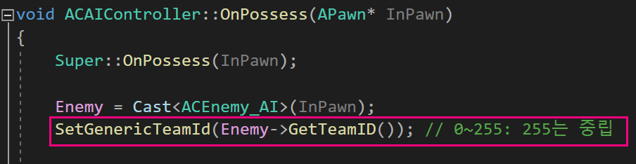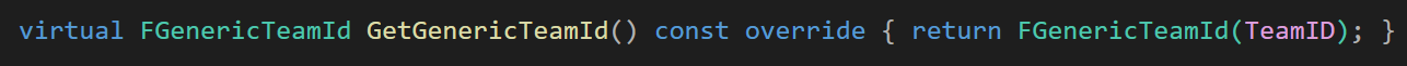 또한 IGenericTeamAgentInterface 인터페이스에 GetGenericTeamId 함수는 무조건 NoTeamId를 반환하도록 만들어져 있기 때문에 설정한 TeamID(1)가 반환될 수 있도록 함수를 오버라이드 해주었다.